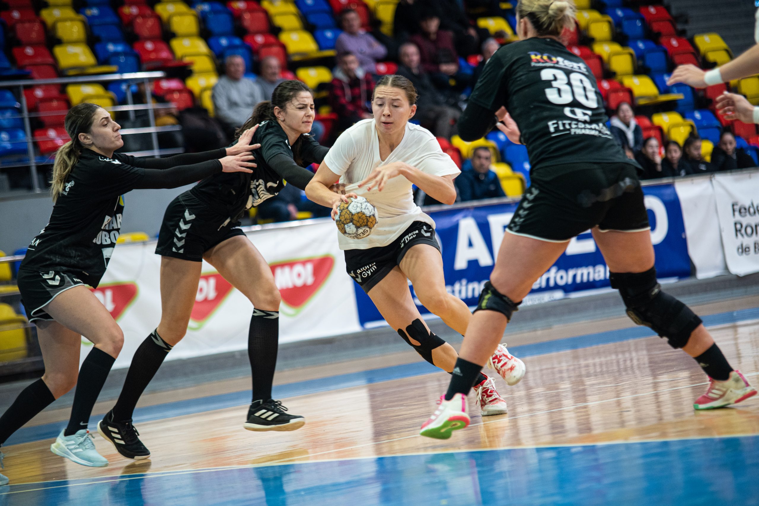 Meciul de sâmbătă a debutat într-o notă de echilibru, cu echipa oaspete care a deschis scorul de la 7m. Jocul gorjencele a funcționat bine în extremă, acolo de unde Florența Dumbrăvean și Andreea Chiricuță au adus avantajul pe tabelă, scor 3-2, după primele 5 minute de joc. În poartă, Andreea Chetraru a avut două intervenții bune, iar pe contraatac, Bianca Chiriță și Iuliia Andriichuk au dus scorul la 5-3. Unirea Slobozia a dat replica și a reușit să revină la conducere, scor 5-6 în minutul 10. Bianca Chiriță a restabilit egalitatea, iar Andreea Chiricuță a marcat pentru 7-6. Slobozia a ținut aproape, dar Ira Zinatullina și Bianca Chiriță au dus scorul la 10-8, la jumătatea primei reprize. Iuliia Andriichuck a marcat următoarele două goluri pentru echipa noastră, pentru 12-11. Slobozia a egalat la 12, iar în poartă a fost trimisă Ljubica Nenezic, care a închis poarta preț de câteva minute bune, timp în care Maria Gavrilă, Florența Dumbrăvean, Ira Zinatullina, Andreea Chiricuță și Fanta Keita au marcat rând pe rând pentru 17-13. Liviu Andrieș și Andrei Enache au profitat de acest meci și au testat-o și pe jucătoarea adusă de la echipa de tineret, Luiza Maria Cergă. Pe final de primă repriză, Unirea Slobozia s-a apropiat la doar un gol pe tabelă, scor 18-17 la pauză.